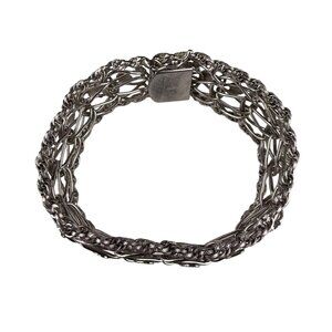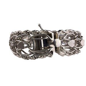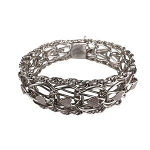 This exquisite vintage bracelet showcases timeless craftsmanship in sterling silver, boasting an intricate chain and oval-linked heart motif design. A hallmark of elegance, the clasp features delicate detailing alongside an "R" maker's mark, ensuring its authenticity. The hearts are textured for added charm, set against a backdrop of finely woven chains that enhance its sophistication. The bracelet measures 7 inches (17.8 cm) and is made entirely of sterling silver, highlighting its durability and classic appeal. A true piece of wearable art, the design reflects mid-20th-century vintage aesthetics, combining functionality with artistry. This is a statement piece offering a graceful touch to any ensemble, perfect for those who appreciate vintage elegance.