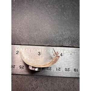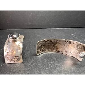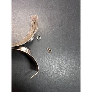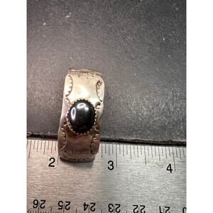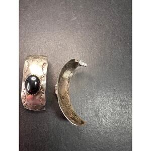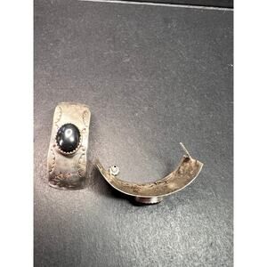 Pre owned vintage condition with light patina and handmade character. These wide sterling silver earrings feature domed hematite cabochons set in scalloped bezels and accented with hand-stamped sunburst and scalloped motifs. Acid tested and verified sterling silver with no hallmark, typical of older artisan Southwestern work. Each earring curves comfortably on the ear and has secure post backs; one back appears to be a later replacement. Lightweight enough for everyday wear but bold in style. A striking vintage pair for any silver or hematite lover.