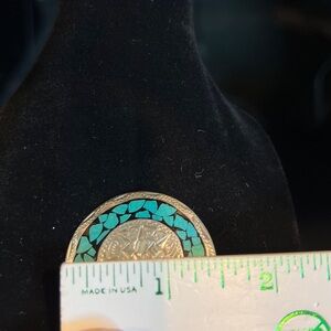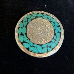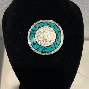 Vintage Sterling Silver Inlaid Turquoise Aztec Pin Brooch Pendant 1 1/2’ Round
