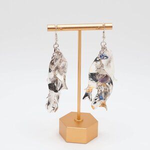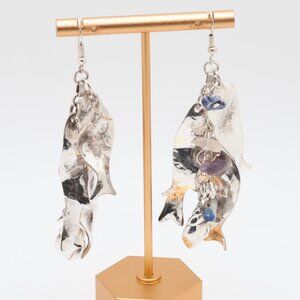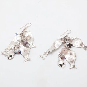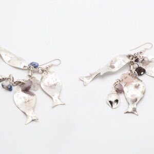 These Dangle Sterling Silver earrings are long, and 65.7 x 19.5 mm wide. The earrings weigh 21.2 Grams. The Stone/Theme is Fish . Size/Stone measurement is Some Rocks (seems like Amethyst, Lapis Lazuli, Glass) mm. Markings: Not Marked , (Tested Sterling Silver guaranteed to be so). Condition: Very good, moderate patina . Extra Note: . Thank you for viewing our shop!