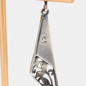 These Dangle Sterling Silver earrings are long, and 40.3 x 15.4 mm wide. The earrings weigh 6.2 Grams. The Stone/Theme is triangle, Leaf . Size/Stone measurement is Shell, Marcasite mm. Markings: Symbol, 925, (Tested Sterling Silver guaranteed to be so). Condition: good, lots of patina, missing Marcasite on a dangle part of the earring . Extra Note: . Thank you for viewing our shop!