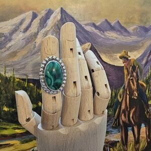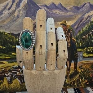 Vintage Sterling Silver Malachite Stone Statement Ring Oval Round