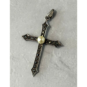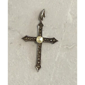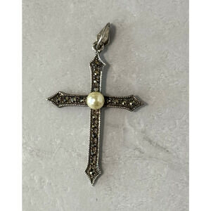 Vintage Sterling Silver Marcasite & Pearl Cross Statement Necklace Pendant 2"