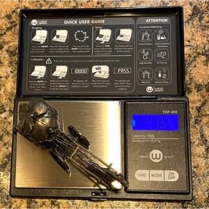 The horse and carriage are about 3 1/2" long, 1" wide, and 1 7/8" tall. It weighs over 47.5 grams. Measurements are also in the photographs.