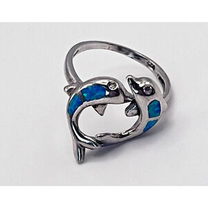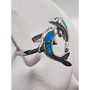 This vintage sterling silver pendant features a modernist design of two playful dolphins riding a wave. The piece is accented with a stunning blue opal, creating a beautiful representation of the beach and aquatic animals. The pendant is crafted with 925 sterling silver and comes in a ring size 6, making it a fine addition to any jewelry collection. The piece is branded by Blue Wave and has a customized theme of beauty, luck, love, animals & insects, and the beach. This original piece is perfect for any lover of vintage and antique jewelry.