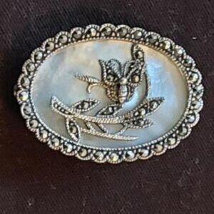 Vintage Sterling Silver Mother of Pearl Inlay Marcasite Butterfly Scene Brooch