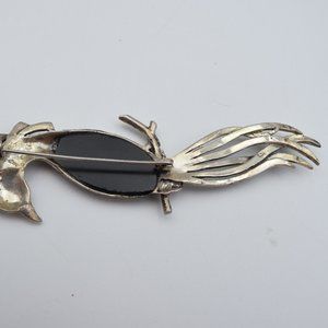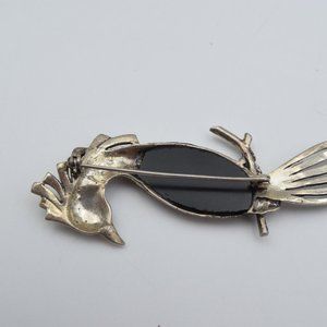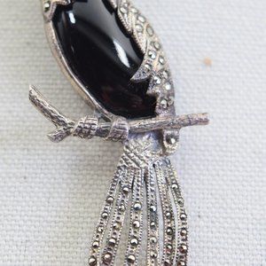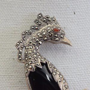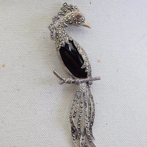 Vintage Sterling Silver, Onyx, Marcasite, & Garnet Crested Long Tail Bird Brooch