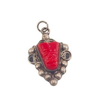 This unique vintage pendant features a striking tribal mask design crafted from red Onyx and set in sterling silver. The intricate detailing and bold color contrast make it a standout piece of jewelry. Ideal for adding a touch of ethnic flair to your collection or gifting to someone with a love for vintage accessories.