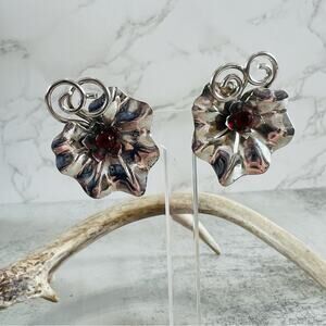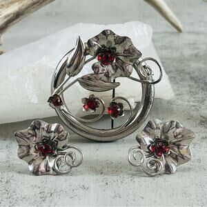 Vintage Sterling Silver Red Stone Floral Brooch Screw Back Earrings Set