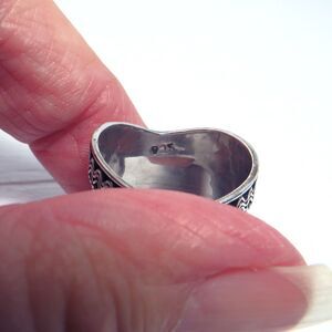 The stone is 7 mm long and 5 mm wide. The band is 17 mm wide at its widest part. The 925 is engraved inside the ring. It comes with a silver polishing cloth and an organza bag. It was in my gift shop, which I closed in 2003, and has been in storage since then.