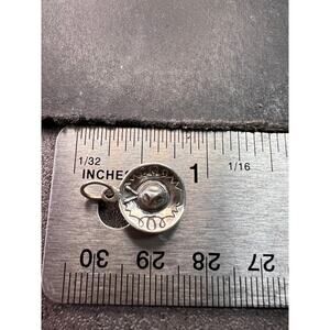 Vintage sterling silver sombrero hat pendant charm featuring a raised domed crown with decorative etched detailing around the brim. Stamped 925 and acid-test verified as genuine sterling silver. Measures approximately 0.75 inches in diameter (not including bail) and weighs 1.47 grams as shown in photos. Classic Southwestern / novelty motif likely dating to the 1980s–1990s. Perfect for a charm bracelet, necklace layering, or souvenir-style collection piece. Estate acquired, pre-owned in good vintage condition with natural patina consistent with age.