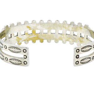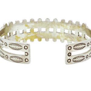 This is a remarkable vintage sterling silver Navajo petit point Cuff bracelet that is jeweled with 24 snake eye turquoise cabochons. It measures approximately 2 1/2 inches wide by 2" front to back and is adjustable It weighs 25.5 grams. This is an older southwestern cuff bracelet dating back to the 1940-1950s. It is stamped "STERLING" and is in excellent condition and has not been polished.