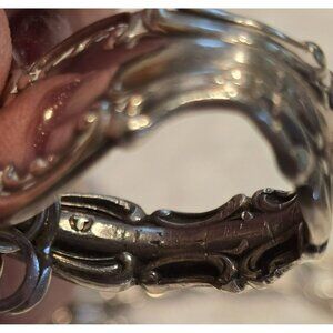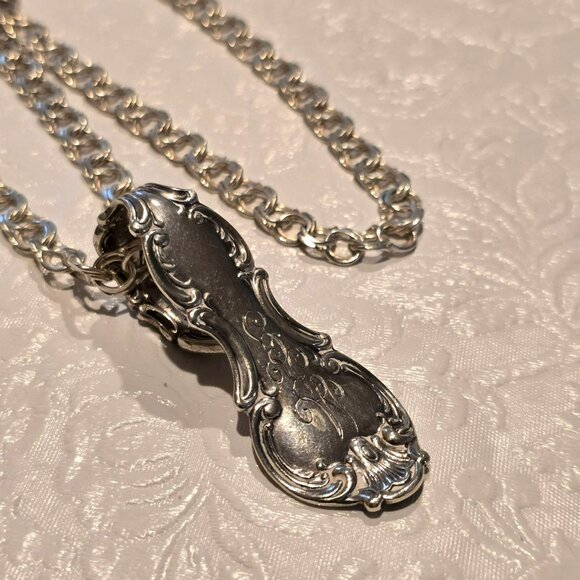 A meticulously crafted vintage pendant showcasing an intricately designed sterling silver spoon handle, transformed into an elegant accessory. The piece combines historical craftsmanship with contemporary jewelry design, featuring elaborate baroque-style scrollwork and a refined double-link chain.