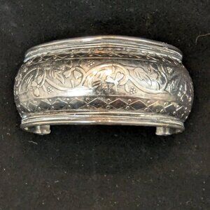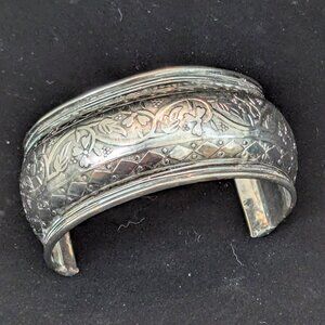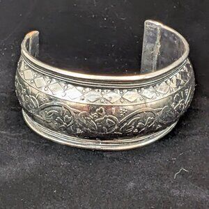 This stunning vintage cuff bracelet is crafted from tested sterling silver and features an intricate, detailed design across its wide band. The craftsmanship suggests a likely Asian or Art Nouveau origin, with techniques like repoussé and chasing used to create a beautiful, raised floral and vine pattern. Style: Wide, open-cuff style with a continuous, deep-relief engraved botanical pattern. Ornate, textured, and likely hand-carved, exuding a unique tribal or antique aesthetic. Condition: Vintage condition. Note the patina and natural wear consistent with age, which adds to its character. Unique design, wide statement piece, potential antique or collectible value.