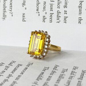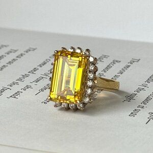 Stunning vintage sterling silver statement ring featuring a brilliant emerald-cut yellow gemstone surrounded by sparkling clear stones. Bold, elegant look perfect for special occasions or daily glamour. Size 6. Eye-catching and timeless piece for your collection.