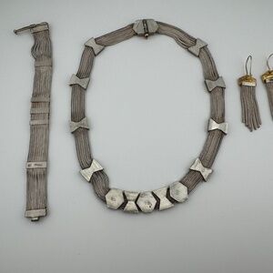 This vintage sterling silver and enamel Byzantine-style Anatoli-designed suite weighs 128g and includes a necklace, bracelet, and earrings. The pieces are signed by Anatoli and made of sterling silver with enamel details, showcasing a Byzantine chain type. The set exudes a classic yet distinctive charm, perfect for jewelry enthusiasts seeking a timeless, vintage addition to their collection. The bracelet is 7" long and necklace is 18" long.