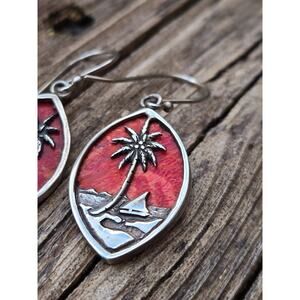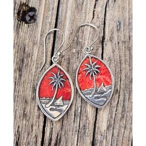 For the "beachy" girl in you! These cute little beach themed dangle earrings are just so cute! They feature a cut out beach scene including the ocean, a sail boat, beach and a palm tree all done in 925 sterling silver against a bright red/orange coral stone background. So gorgeous...see photos for better description.