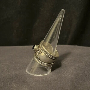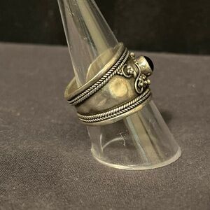 This elegant vintage ring features an Onyx stone set in a beautifully detailed sterling silver wide band with grapes motif. Please review all the photos as they are part of the description.