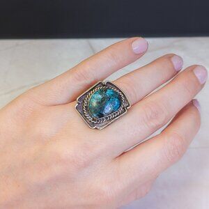 Keywords: sterling silver ring, turquoise ring, Southwest jewelry, Navajo style ring, statement ring, large turquoise cabochon, boho ring, vintage silver, size 4.75, pinky ring, artisan silver