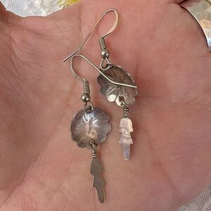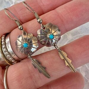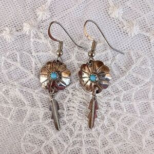 Vintage Sterling & Turquoise Flower Concho Feather Dangle Earrings