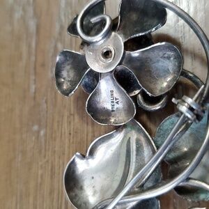 Beautiful Vintage heart flower brooch with amethyst stone in center flower. Marked Sterling AT. It has some wear, see all photos approx 2" length 1" wide