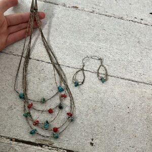 Vintage Sterling Layered Necklace With Turquoise Chunk Accents With Earrings