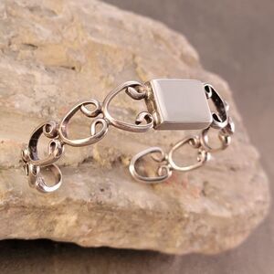 Vintage artisan crafted sterling silver open scroll work cuff bracelet. The piece features an engravable plate for personalization.
