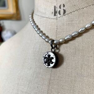 This vintage necklace measures 17 inches long and features a round charm with a 6 point star over abalone / mother of pearl encased in .925 silver. The star is made up of small rhinestones, I am unsure what the material is for the rhinestones. The necklace is strung with grey potato pearls. There is some loose space on the necklace, but can't be seen while wearing. Very pretty piece that would look great everyday, but would be extra nice romantic look for antique and vintage style wedding / bridal jewelry.