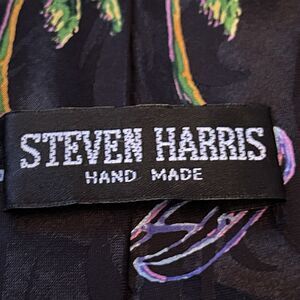Add a touch of tropical paradise to your wardrobe with this vintage Steve Harris tie. The handmade polyester tie features a colorful palm tree print, perfect for a sunny day out on the town. The tie is made in Korea and measures classic in length and width, suitable for any occasion.