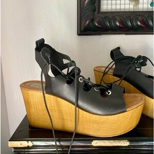 Wooden style platform, lace up, open toe, Y2K, leather, good preowned condition.