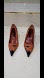 A pale burgundy red suede with black leather on the toes and back of shoe. Features a heart cut out metal buckle at the toe with silver metals studs.