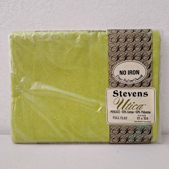 The Vintage Stevens Utica Full Flat Sheet in Lime Green is a new, sealed collectible item perfect for adding a pop of retro style to any bedroom. This solid-colored fitted sheet, measuring 81 x 104 inches, is ideal for a Cal King sized bed. The vibrant lime green color and vintage design make it a unique addition to any linen collection, adding a fun and nostalgic touch to your sleeping space.