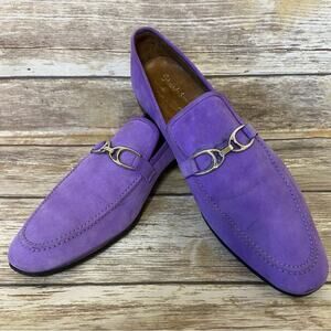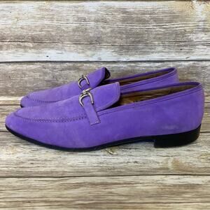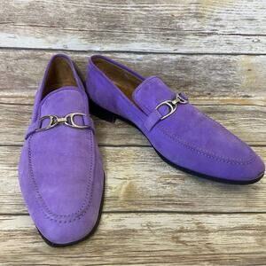 Vintage Stewards Sahara 10 lavender horse bit suede loafer. pair of purple suede loafers with a decorative metal bit on the vamp. They are branded "Stuards-Sahara," as indicated by the gold lettering on the insole. This brand appears to be associated with locations in Las Vegas and Palm Springs, and the shoes are noted to be made in Italy. The craftsmanship and materials are high-quality, luxury footwear, suitable for stylish and formal occasions.