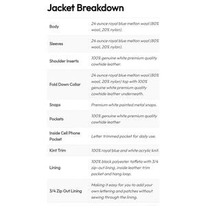 The original American royal blue and white retro jacket, made of 24 ounce royal blue wool with white cowhide leather inserts and collar.