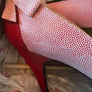 Sassy vintage Stewart Weitzman pumps size 8 1/2. Made in Spain. Comes with box and original tissue paper. From the 1980's. Red heel with 3 X's and a bow (corset back) made of the red and white dotted leather used on the rest of the pump. See photo for pattern. Great vintage condition with slight scuff mark on the outside of the left shoe near the outside toe. Small spot on right shoe where foot bends. See photos.