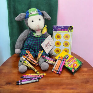 Zoom in on photos for details. Appearance may vary with background, lights, or screen. You will receive the exact three Crayola - Hallmark items shown. Along with the adorable goat plush, your bundle includes vintage 1993 Hallmark sunflower stickers and 1 pack of 2010 Crayola Hallmark crayons. The stickers are unopened, new-in-package (4 sheets). The crayon box is clean with typical wear to the box. Most of the 24 crayons appear lightly used and a few are more than lightly used (see photo). Gallager Goat plush is clean and in good vintage condition without rips, tears, or stains. Enjoy!
