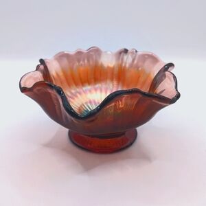 Stunning Stippled Ray Amethyst Carnival Glass Bowl. Measures approximately 2 5/8" tall and 6" wide. This vintage piece exudes beautiful tones of oranges, greens and violets / purples which change with each turn of the bowl. No distinct markings so I'm not sure of the maker or exact date this was made, but Fenton introduced and made Stippled Ray Carnival Glass from 1908 until the late 1920's. A beautiful piece of Carnival Glass to enhance any room or office.