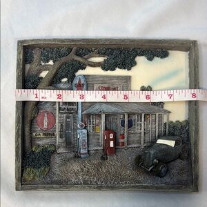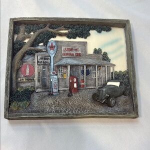 Charming wall art depicting a vintage general store scene. Features a classic car and gas pumps. Perfect for adding a nostalgic touch to any room.