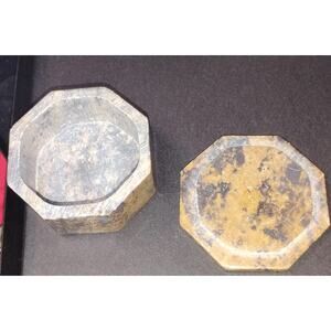 Vintage Stone Octagon Trinket Box with Inlaid Floral Design Brown Marble