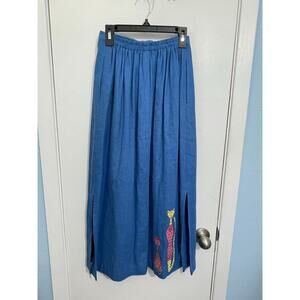 Vintage Stonebridge Linen Blend Maxi Skirt XXS Blue Painted Whimsical Cats Artsy Boho. Skirt is in Great condition, bilateral side slits. Elastic to the back of the waist band. Size tag says P/P. Please see measurements.