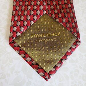 This Stonehenge tie offers a professional edge with its geometric design and bold red and beige colors. Crafted from high-quality silk, it enhances any formal attire with its unique pattern, adding a touch of sophistication to business or formal events.