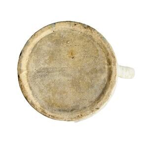 This vintage stoneware pitcher is unmarked and measures 7 inches in width. It is cream-colored with brown accents, possibly made by Morton Pottery. The pitcher is decorative and made of stoneware, weighing 1 pound and 10 ounces. It is a vintage piece, likely used as a vase for home decor.