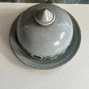 Vintage Stoneware Art Studio Pottery Cheese Dish Hand Painted Flowers Signed