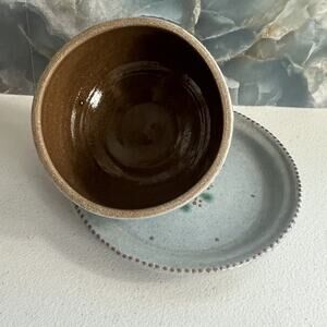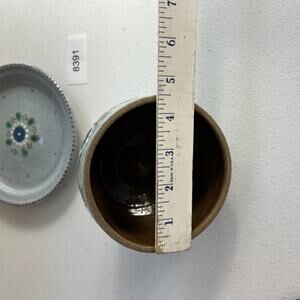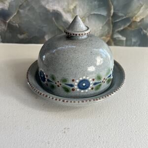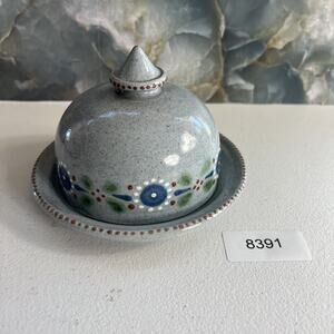 This vintage stoneware covered butter dish is a charming addition to any kitchen or dining table. Hand painted with a speckled floral design, this round dish features a blue, white, and green color scheme typical of arts & crafts/mission style decor. The glossy finish and hand-painted details add to its handmade, unique appeal. With one compartment and a lid included, this signed butter dish is both functional and decorative, making it a lovely choice for those who appreciate vintage pottery and stoneware pieces in their collection. Perfect for butter or as a decorative piece, this butter dish is a timeless treasure for any home.