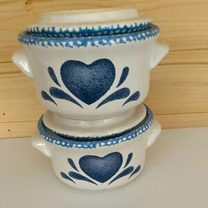 Vintage Stoneware Blue Heart Covered Soup Crock with Handles Set of 2 Farmhouse