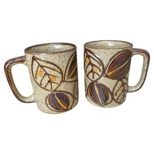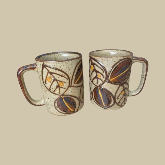 Vintage Stoneware Coffee Mugs Pair Hand Painted Leaf Design 1970s Retro Boho