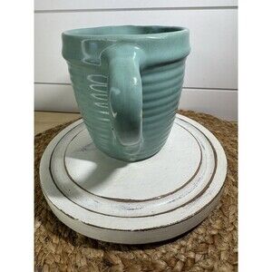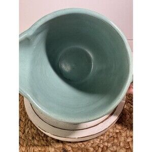 Vintage Stoneware Pottery Blue Green Pitcher Ribbed Sides Ring USA 4.5”