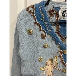 Vintage Storybook Knits Angels Cardigan Sweater Blue Size Medium Heaven Cozy