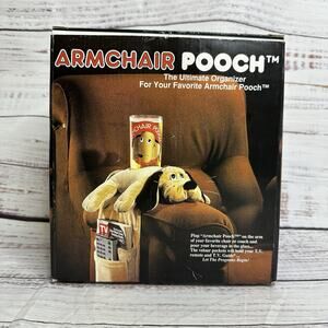 Vintage Stotter 1990 ARMCHAIR POOCH Cup Holder Remote Control Caddy Organizer. The armchair pooch, and the plastic glass are in like new condition. They look as if they were never used. The box has lots of signs of aging and damage. Please see photos.