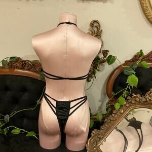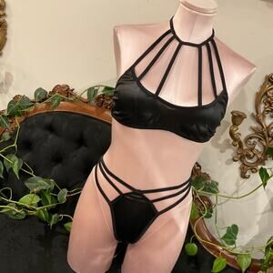 Vintage Strappy Faris Halter Bra Panties 2 Piece Set High Cut Size S Black